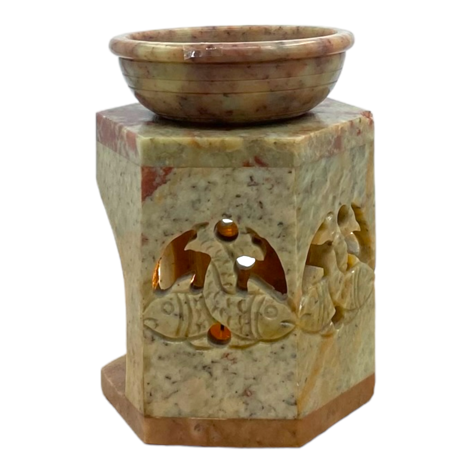 Handgemaakte  spekstenen aromalamp met gekerfde figuren aan 3 zijden; voor het verdampen van bijenwasgeuren. Hoogte 12 cm, diameter 8 cm. Verkrijgbaar in 3 verschillende soorten gekerfde vormen: Omh teken, schildpad of vissen. Met gratis waxinelichtje en bijenwasvormpje.