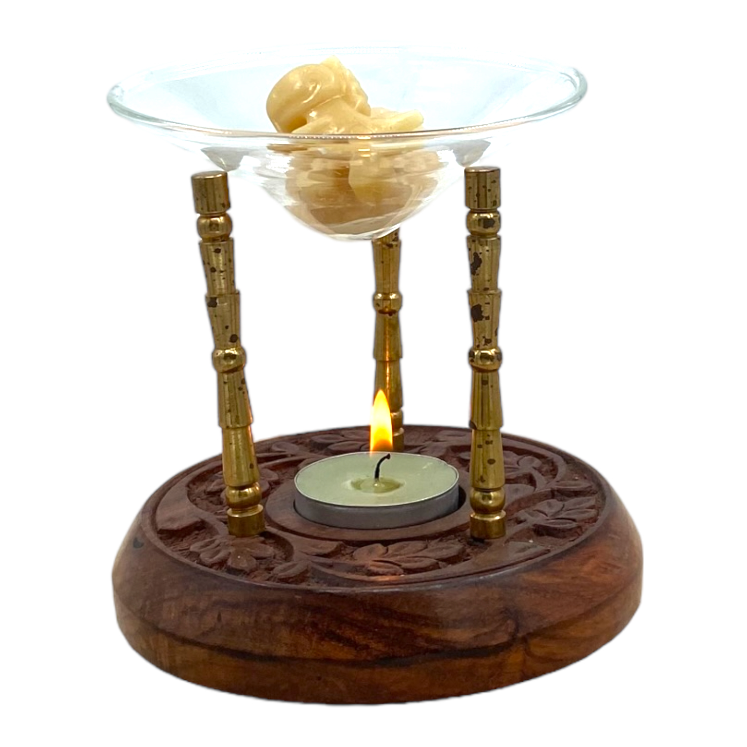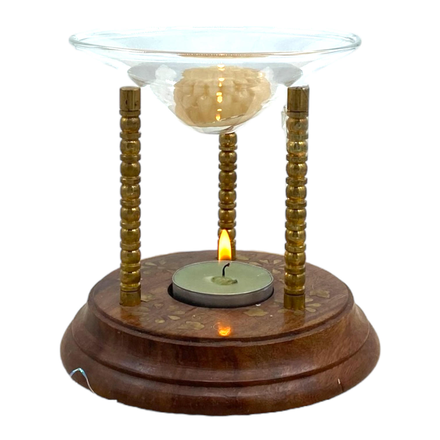 Handgemaakte houten aromalamp met koperen pilaren; voor het verdampen bijenwasgeuren. Hoogte 12 cm, diameter 12 cm. Verkrijgbaar in 2 verschillende soorten vormen: 1.Blaadjes of 2.Bloemetjes (koper). Met gratis waxinelichtje en bijenwasvormpje.