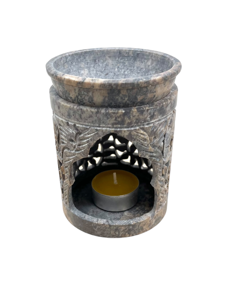 Handgemaakte spekstenen aromalamp. Speksteen (of zeepsteen) is een mineraal in veel kleuren en patronen. De hoogte van deze aromalamp is ongeveer 11 cm. Met gratis waxinelichtje en bijenwasvormpje.