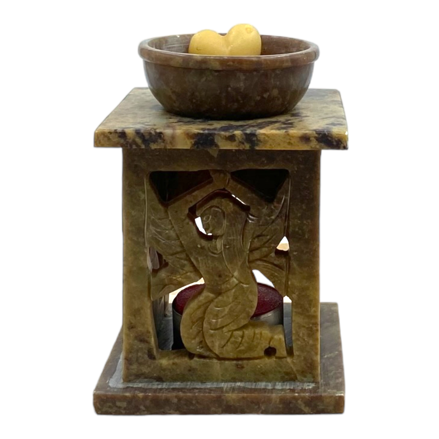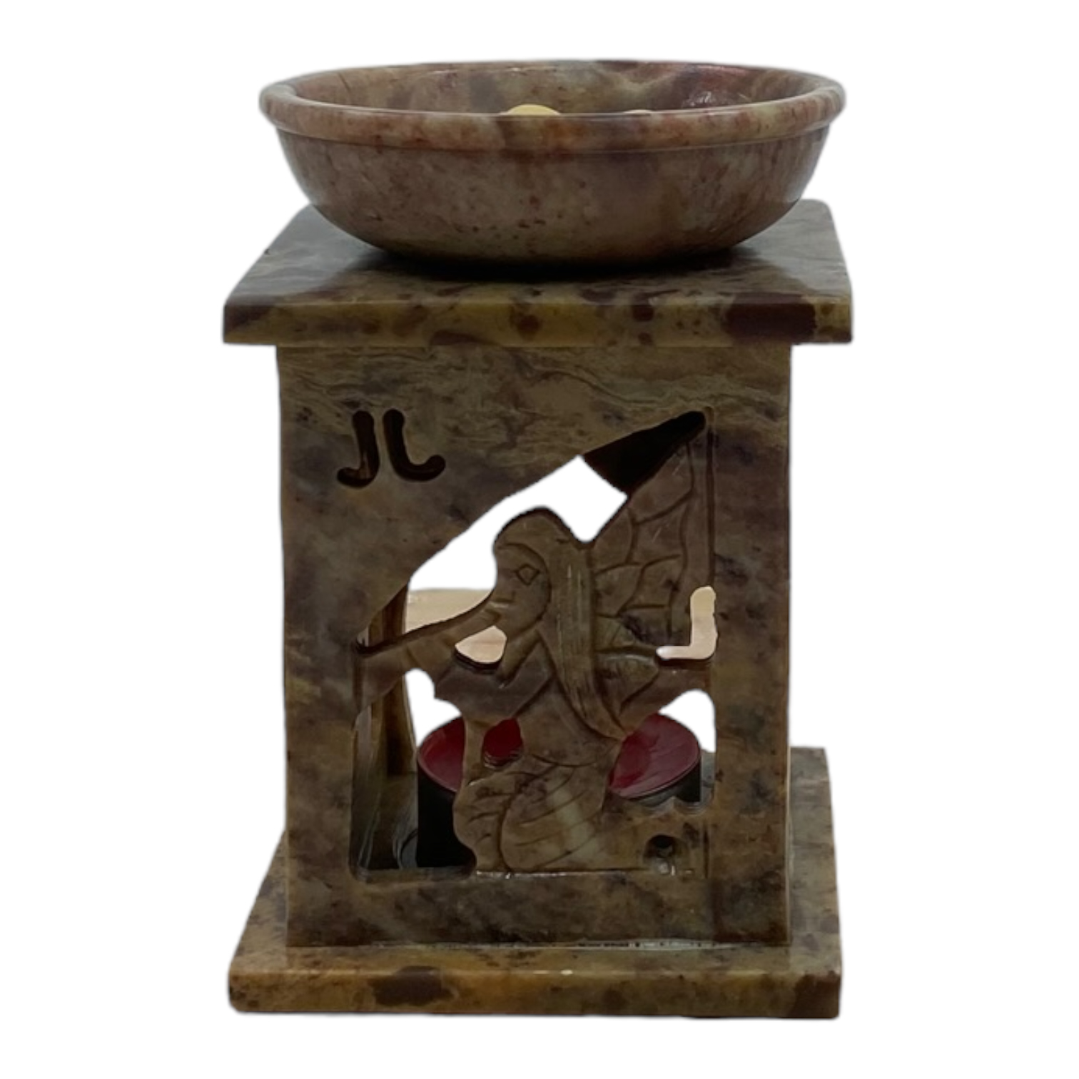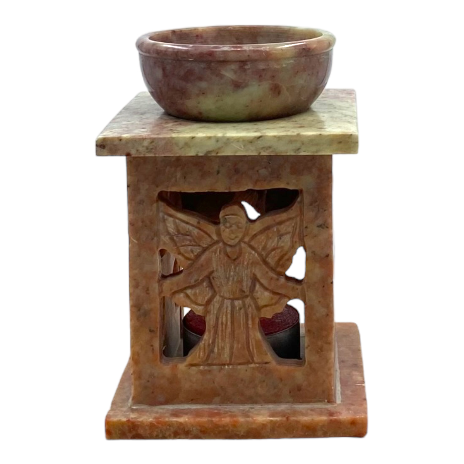 Handgemaakte gladde spekstenen aromalamp met gekerfde engelen aan 3 zijden; voor het verdampen bijenwasgeuren. Hoogte 12 cm, diameter 8 cm. Verkrijgbaar in 3 verschillende soorten: engel – handen omhoog, engel met fluit, en engel met vleugels. Plus gratis waxinelichtje en bijenwasvormpje.