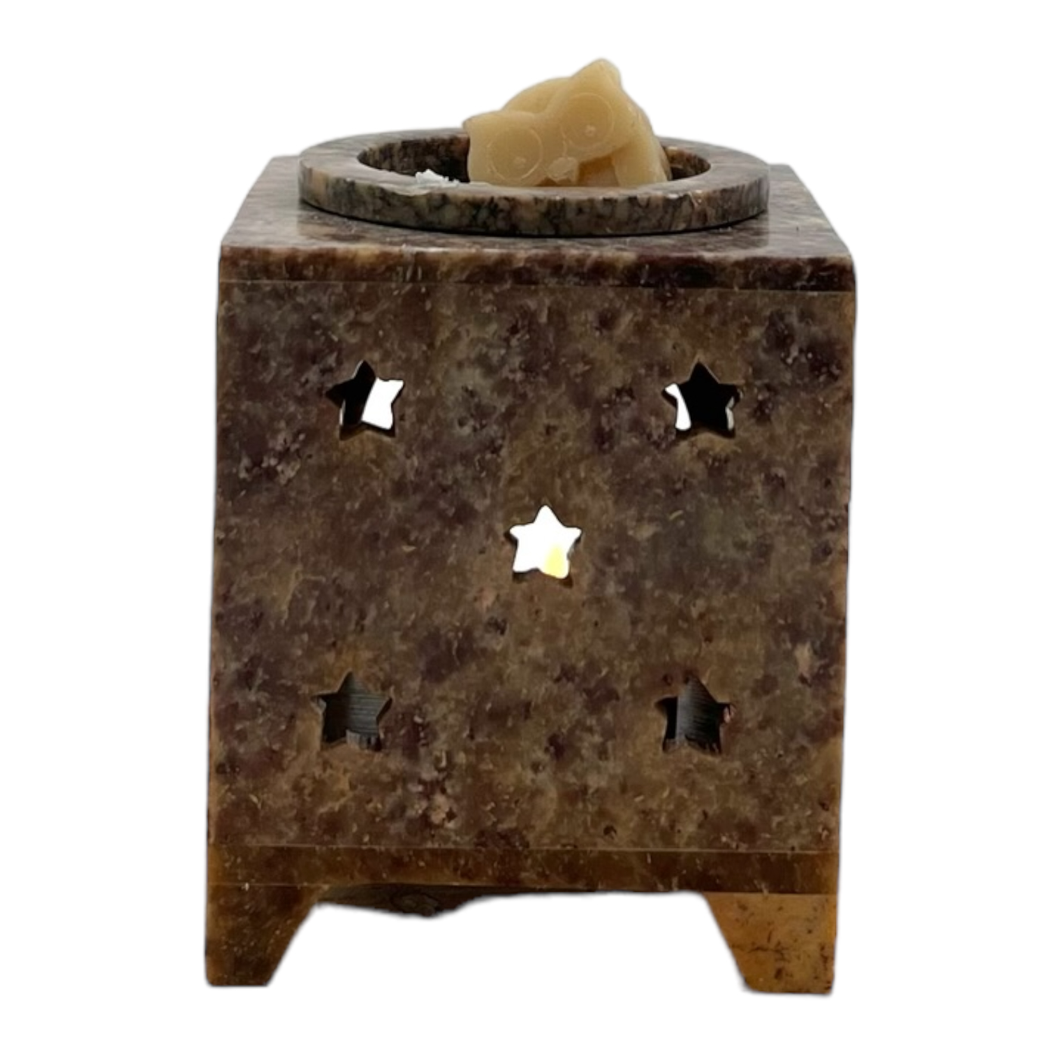 Handgemaakte spekstenen aromalamp met sterren; voor het verdampen bijenwasgeuren. Hoogte 8,5 cm, diameter 8 cm. Met gratis waxinelichtje en bijenwasvormpje.
