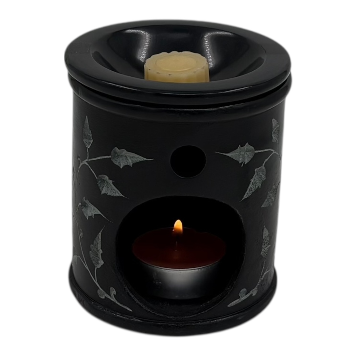 Aromalamp speksteen zwart, gekerfde bladeren, groot