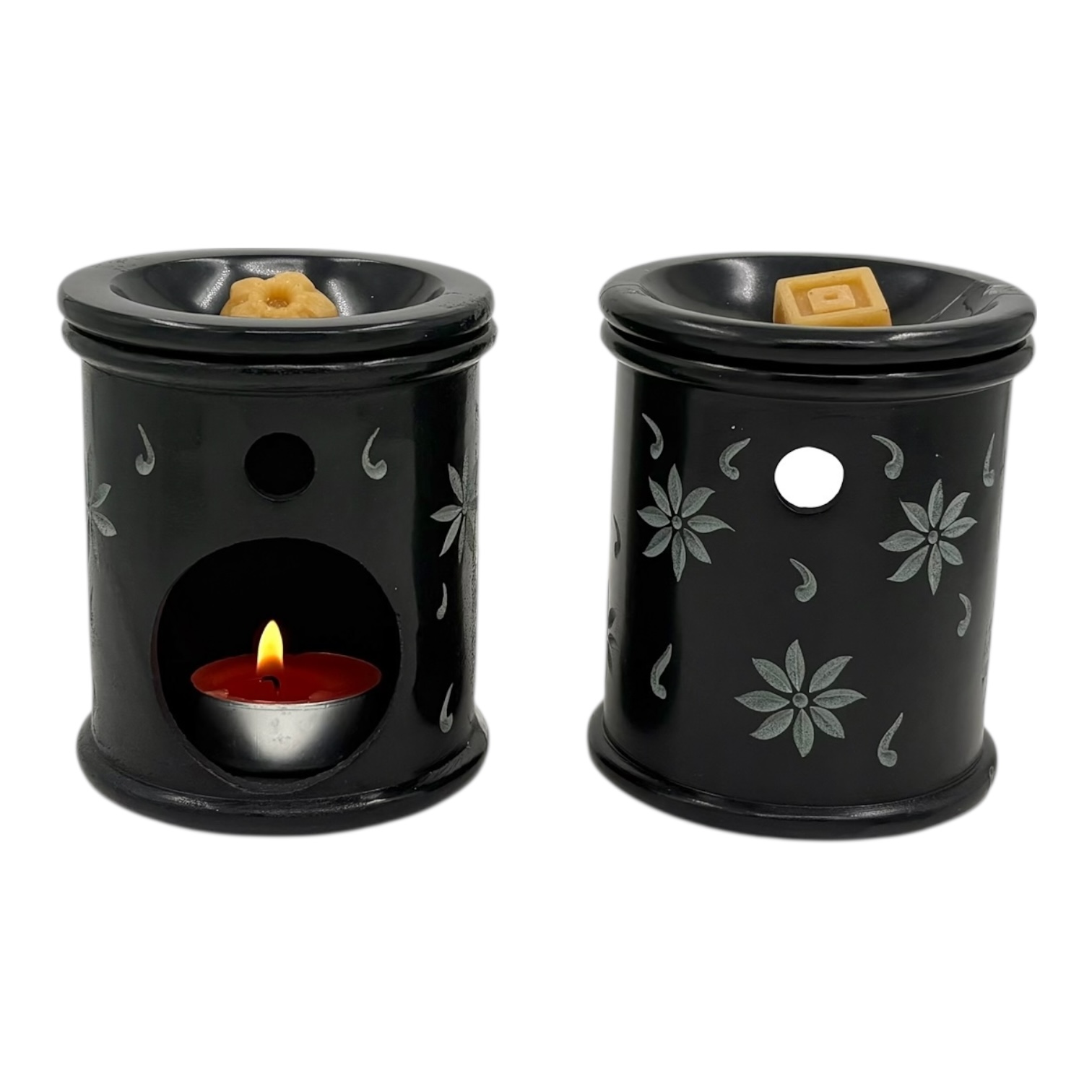 Aromalamp speksteen zwart, gekerfde bloemen