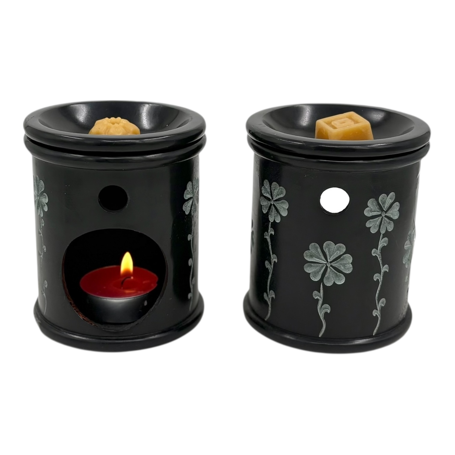 Aromalamp speksteen zwart, gekerfde bloemen