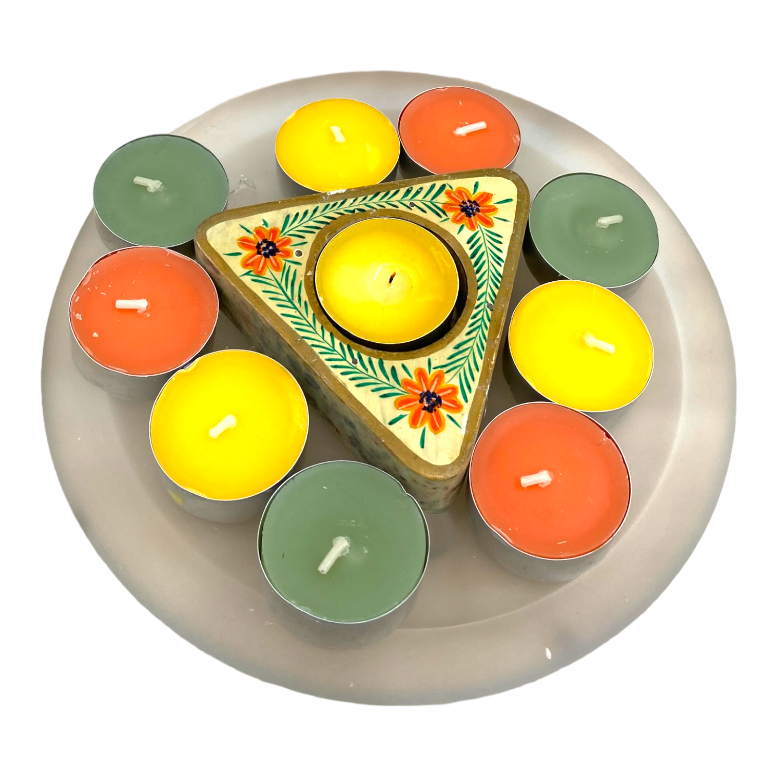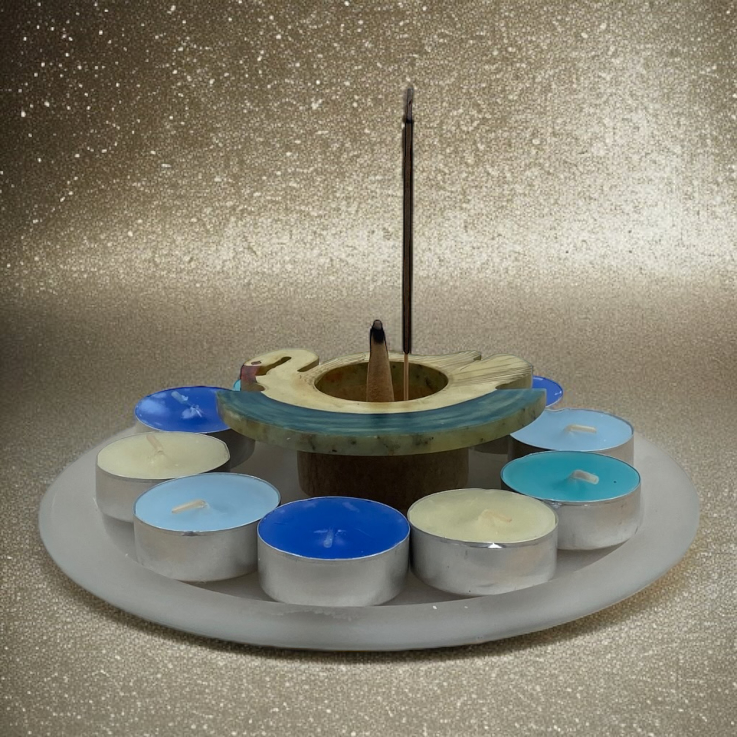 Een prachtig cadeau met handgemaakte, handbeschilderde spekstenen waxine-, (wierook-) en kegelhouder in één op een glazen schaal, met 10 geurende waxinelichtjes.