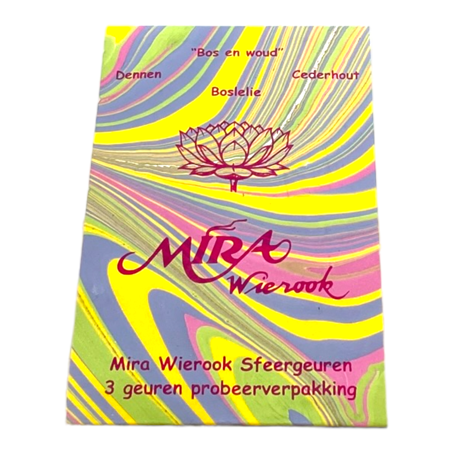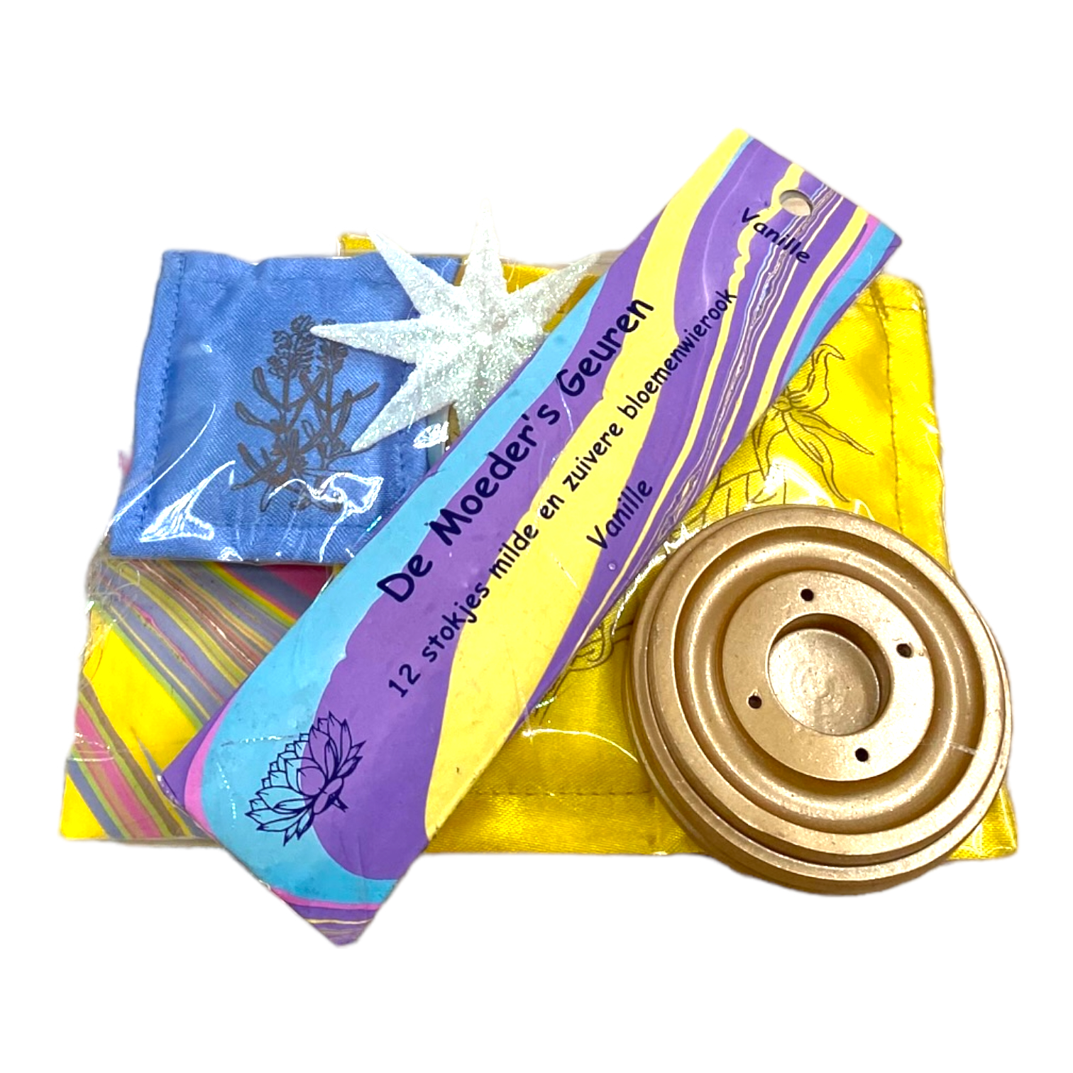 Een cadeau met fantasierijke winterse geuren geuren; met de heerlijke geur Vanille (12 korte stokjes), mini geurkussentje Lavendel Goud, een Ylang Ylang Goud geurkussen, een Bos en Woud probeerpakje (3 x 2 korte stokjes in de geuren Cederhout, Dennen en Herfstblaadjes), en een gespoten spekstenen wierookhoudertje. Wierookhouder kan verschillen in vorm.