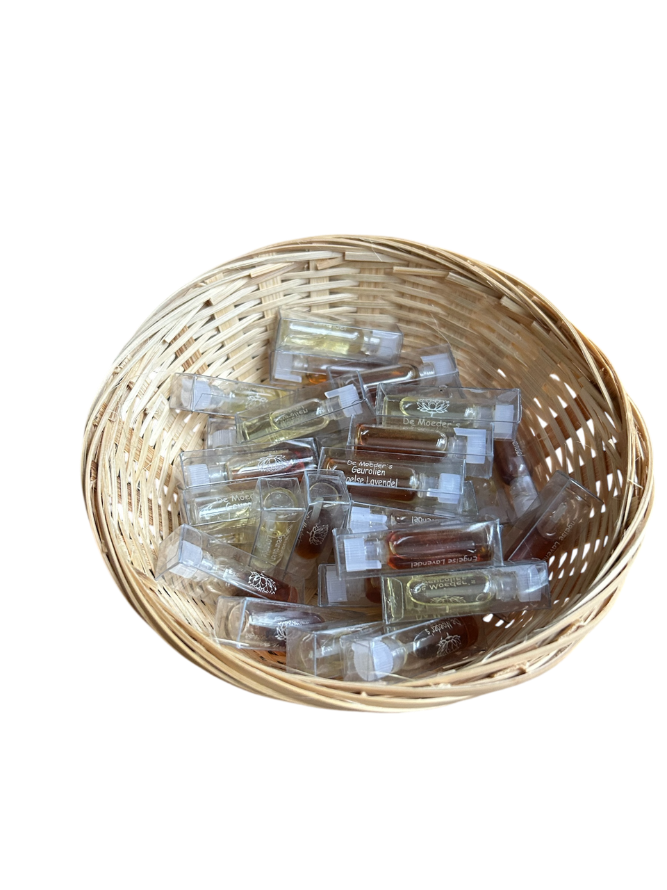 Een mandje met 6×6 flesjes van 1 ml geurolie: 6 verschillende bloemen- en houtgeuren, en 6 flesjes per geur.