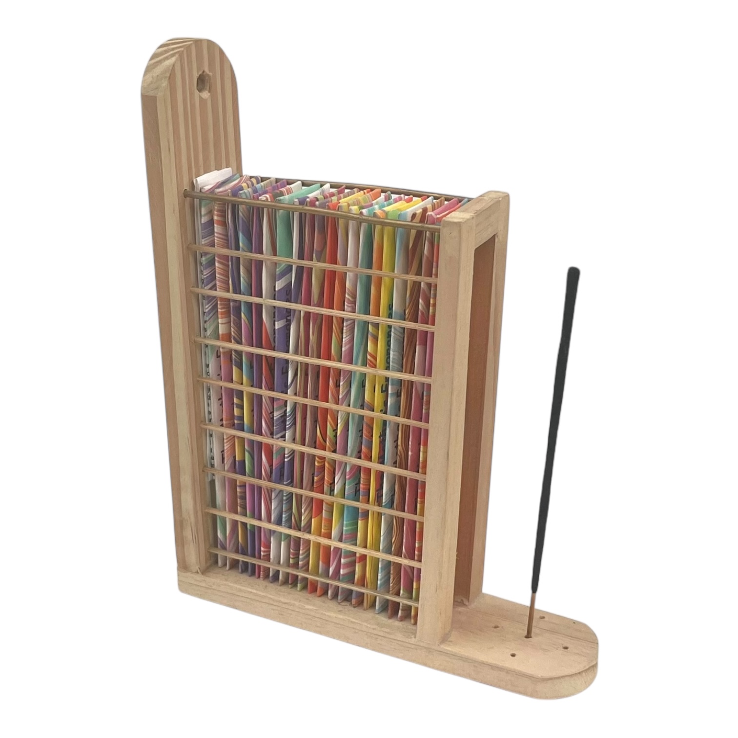 De Moeder’s Geuren nootmuskaat houten muurhouder met een assortiment van 21 verschillende geuren (4 stokjes van 12cm per pakje – 84 stokjes totaal) inclusief brochure met gebruiksaanwijzing en geurbeschrijving. De voorkant van het setje doet dienst als wierookhouder. Op steen of zand zetten.