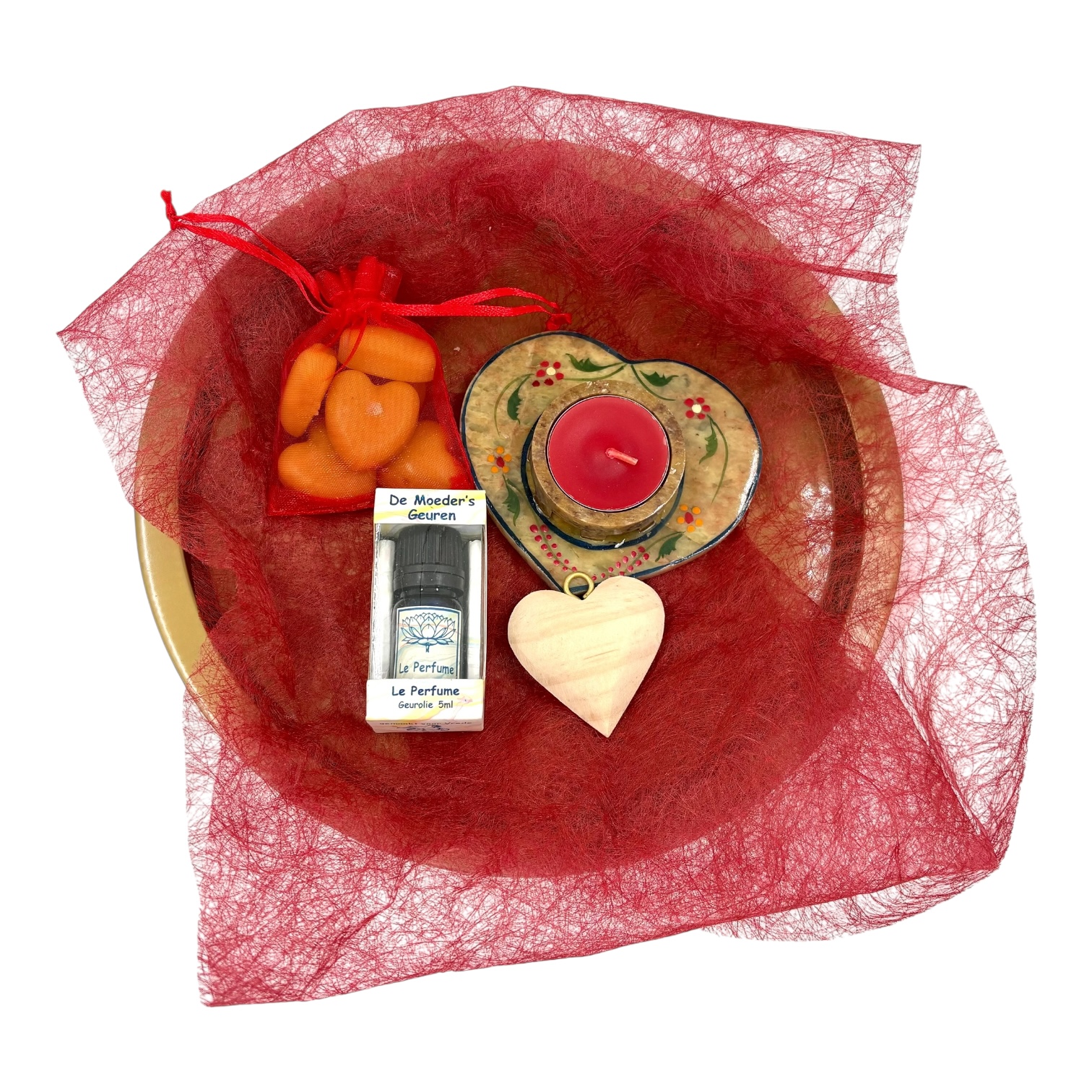 De geurolie Le Perfume, de handgenoten bijenwas-hartjes (met geurolie Le Perfume), een spekstenen 3-in-1 houder (voor zowel wierookstokjes, wierook kegeltjes én voor een waxinelichtje) en een poreus houten hartje om de olie op te sprenkelen.