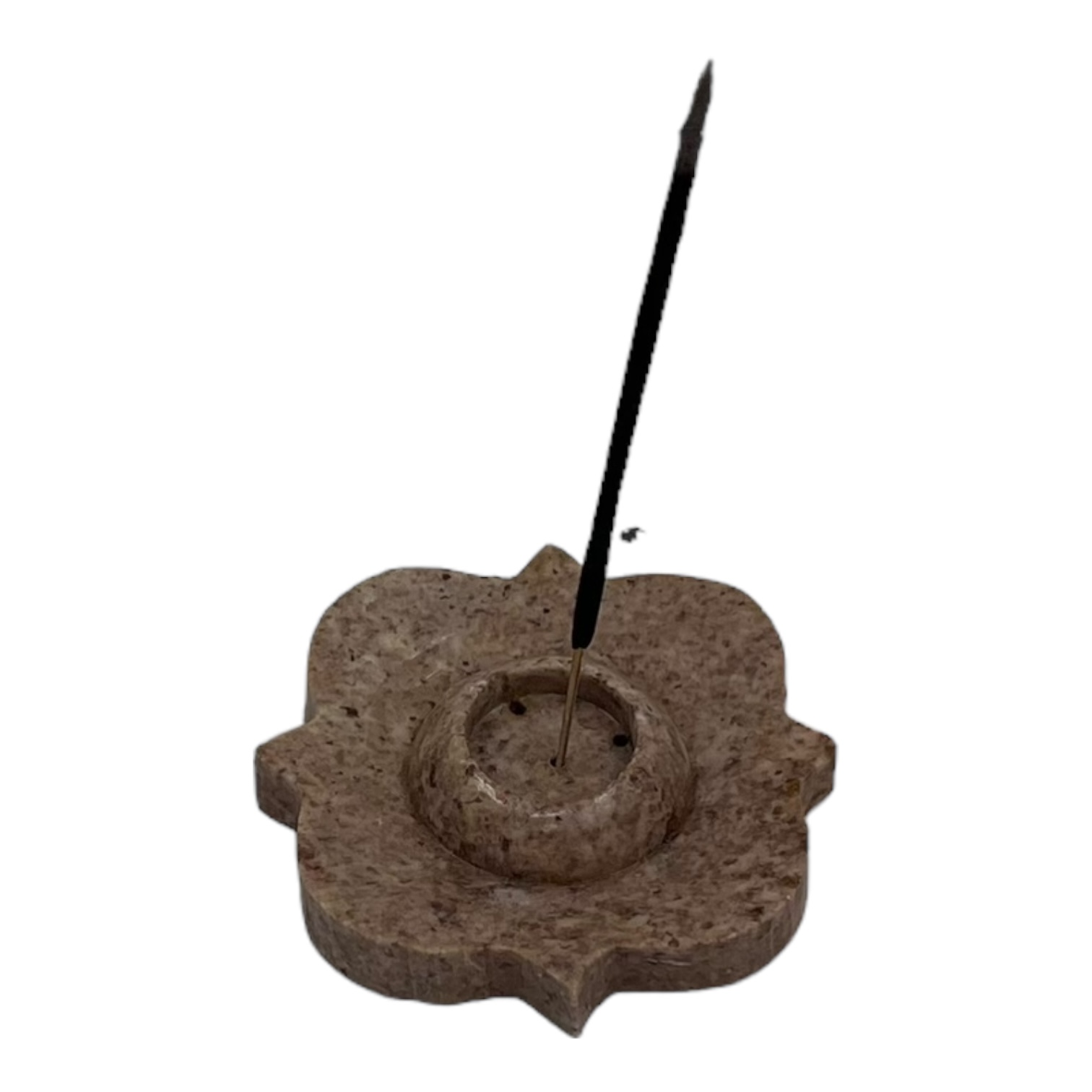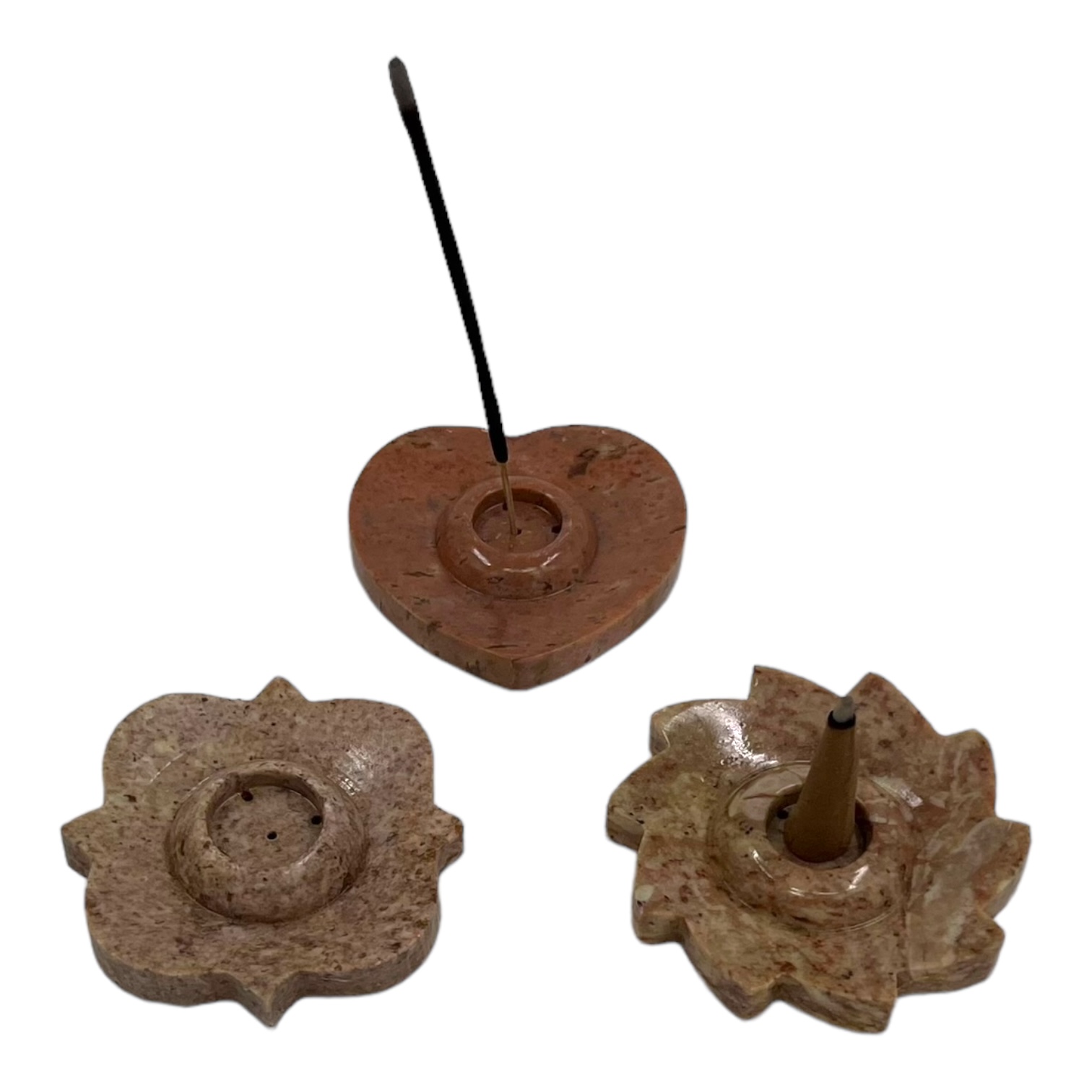 Handgemaakte, spekstenen wierook- en kegelhouder in 3 verschillende vormen; geschikt voor kegeltjes en voor stokjes.