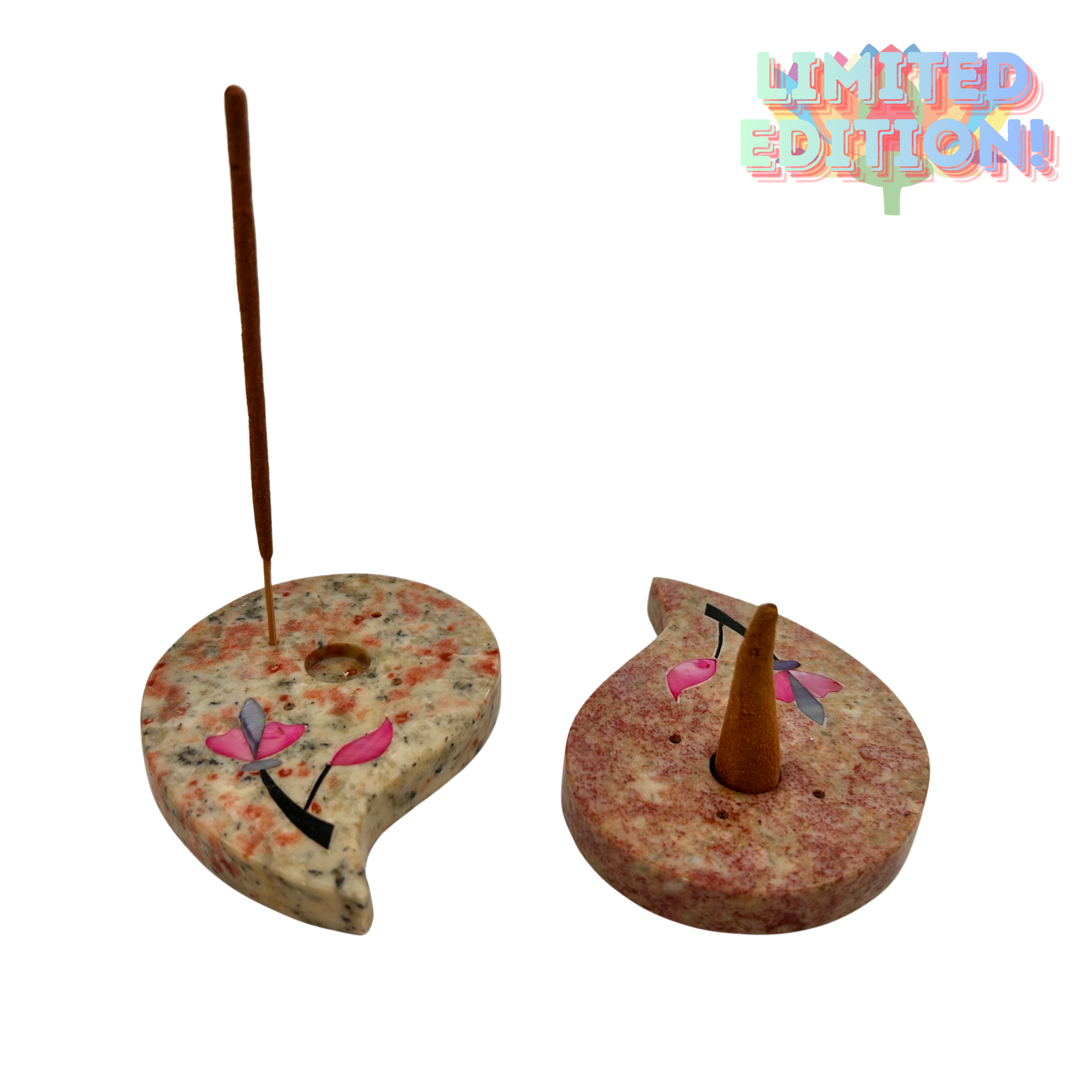 Een bijzondere met de hand gemaakte spekstenen wierookhouder uit Noord-India in verschillende vormen. De gekleurde vlakjes zijn van parelmoer, ook met de hand ingelegd. Deze kwaliteit van vakwerk is bijna niet meer te vinden, vandaar dat we deze wierookhouders ‘Limited Edition’ noemen.