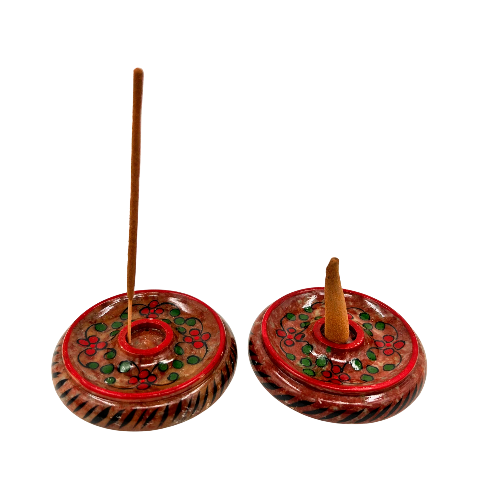 Handgemaakte, glad gepolijste, spekstenen wierookhouder voor het branden van stokjes en kegeltjes. De doorsnee van de wierookhouder is 7,5cm.