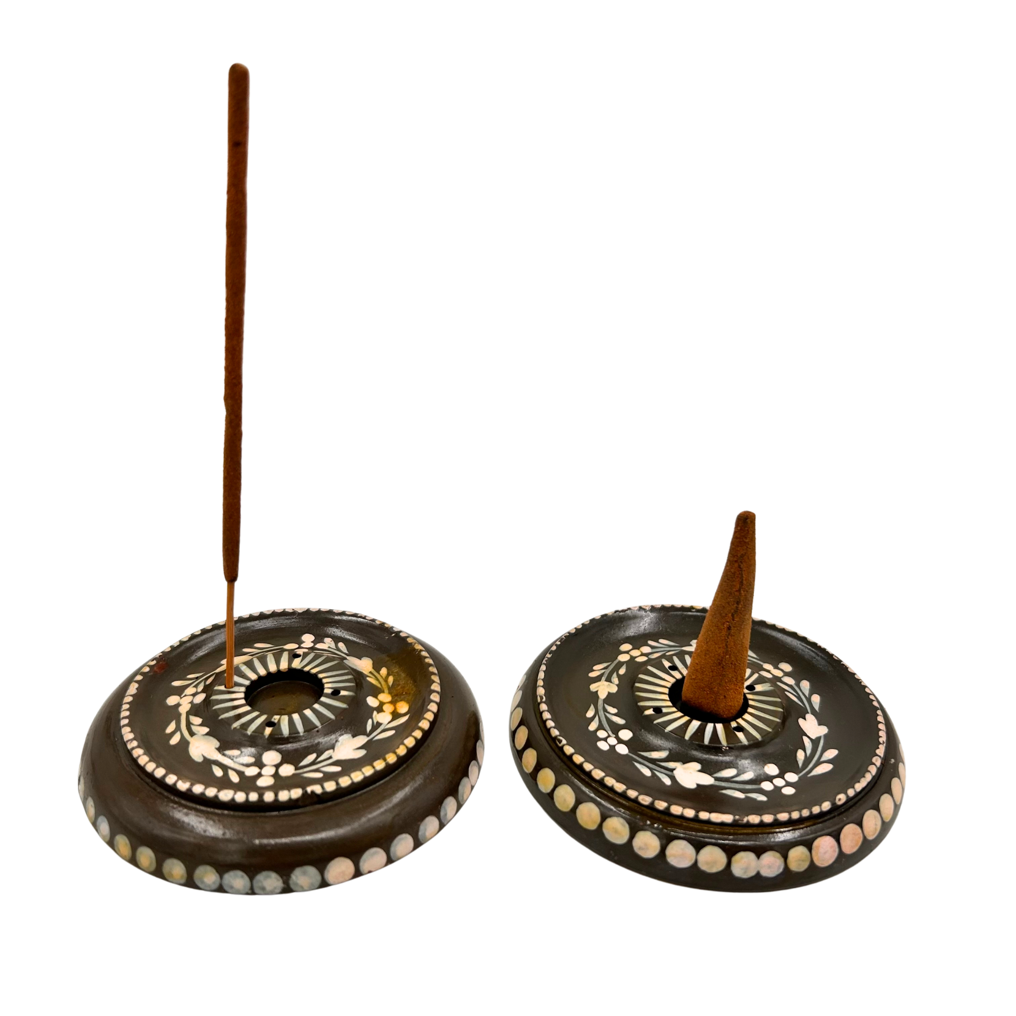 Handgemaakte, glad gepolijste, spekstenen wierookhouder voor het branden van stokjes en kegeltjes. De doorsnee van de wierookhouder is 7,5cm.